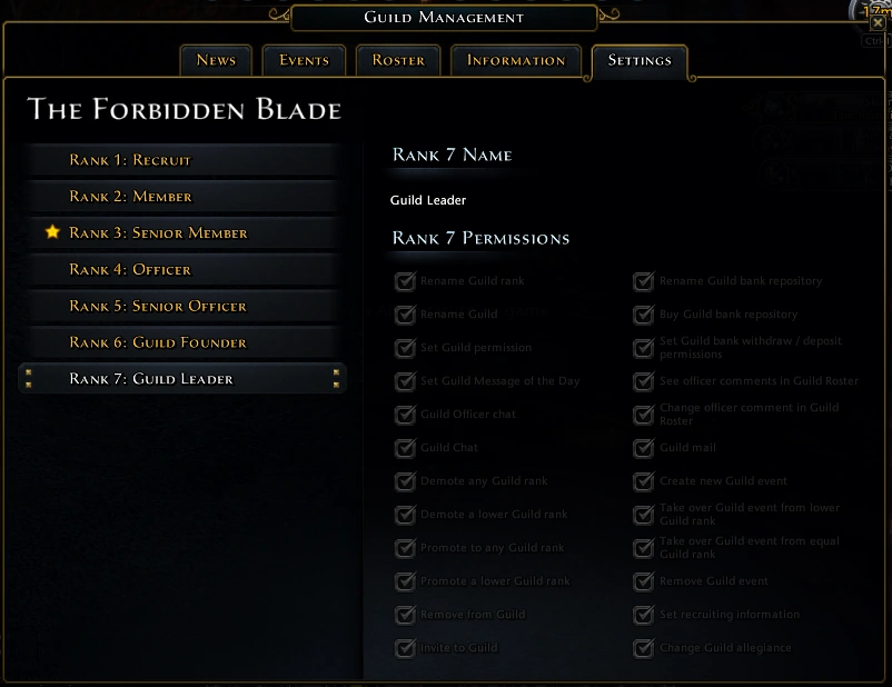 Les membres qui ont des permissions spéciales peuvent placer des commentaires, changer les rangs, exclure des membres ou quitter la Guilde.