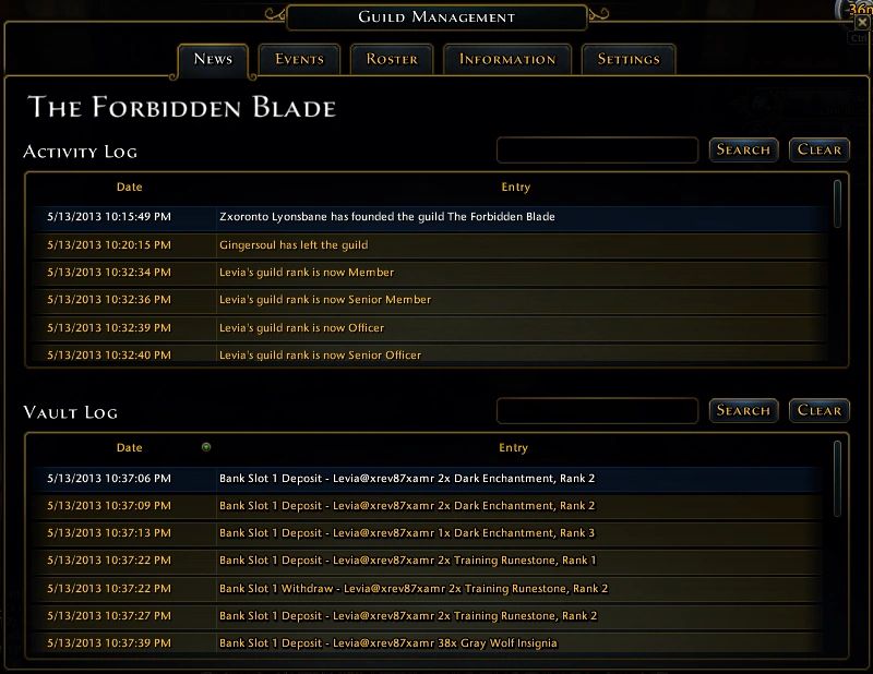 L'onglet des nouvelles possède deux enregistreurs. Le premier enregistre les évènements de la guilde (création, affiliations, promotions, etc). L'autre donne un résumé de la voûte de la Guilde.