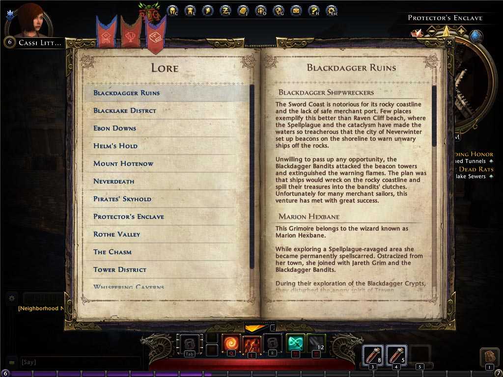 Neverwinter is a game steeped in rich lore, and the Lore tab of the Journal collects information about the Forgotten Realms as you discover it in-game. You might inspect a tattered banner, for example, and uncover a deeper lore entry about the faction that wields it, or enter a new zone and unlock more information about the area's history. Lore is divided into the areas which you discovered the lore, so if you find a note in Blacklake, you can find that specific note's lore in the Blacklake section.