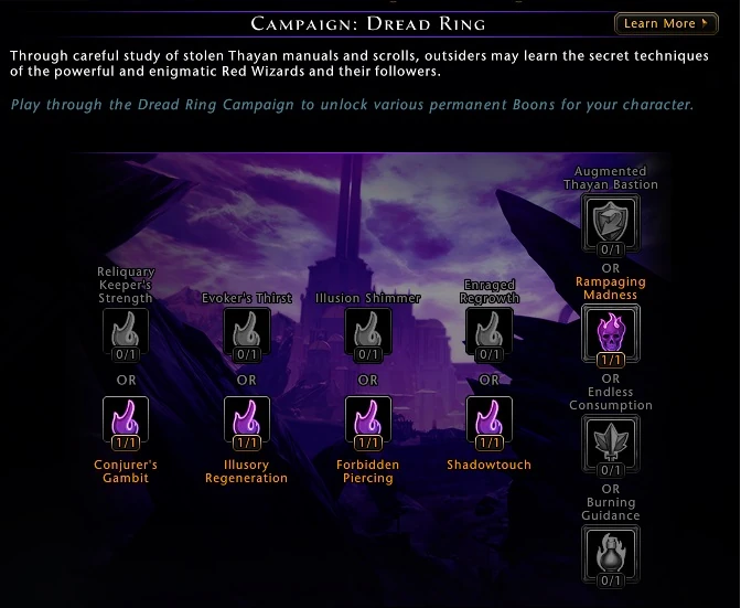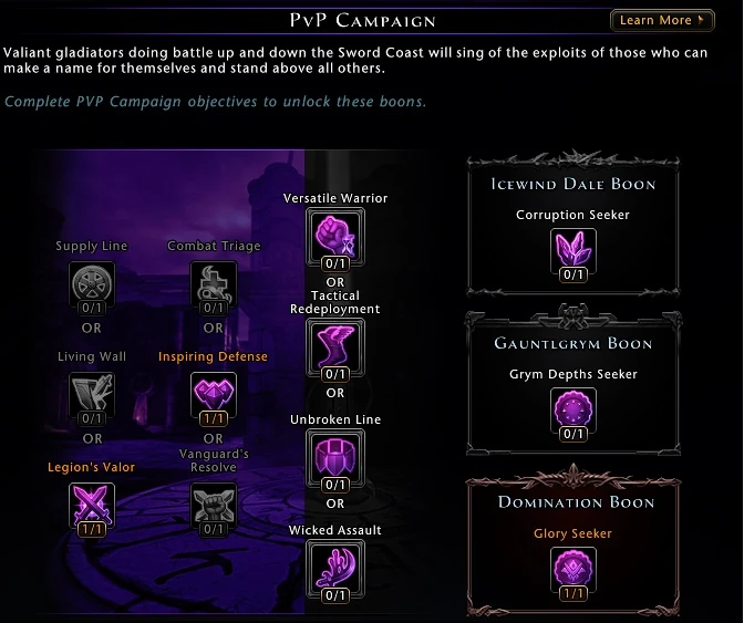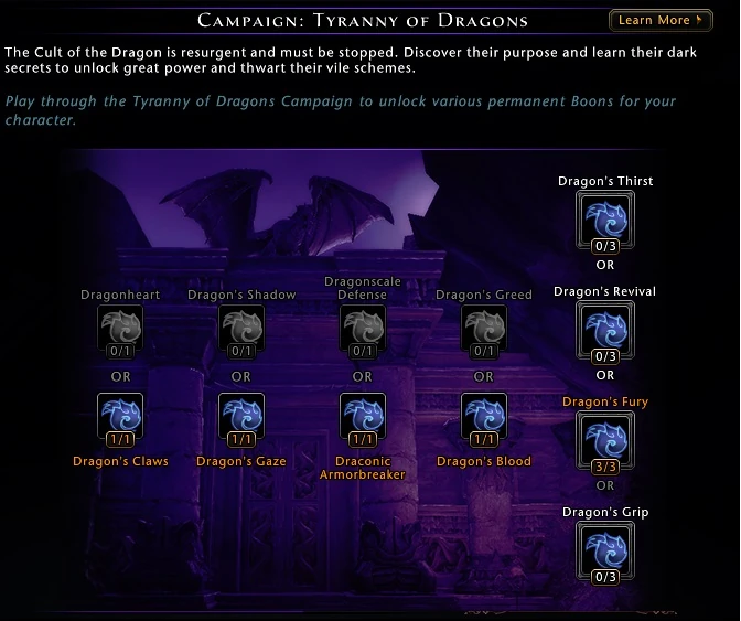 Campain Boons – I stand behind all my boon selections except fo the Tyranny of Dragons campain. I believe I should be 1 in Life steal, 1 in incoming healing and one in critical severity. I wouldn't recomend all points in severity. Eventually I'll get around to respec … eventually.
