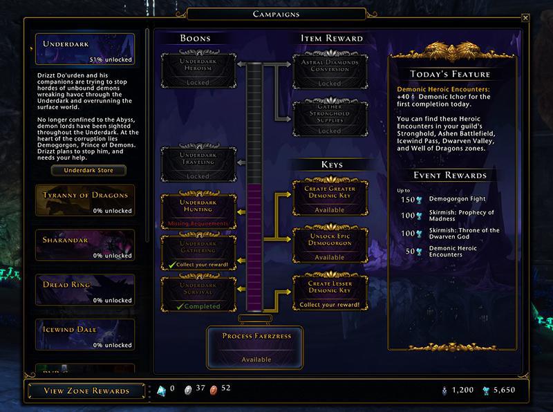 - Demonic Heroic Encounter: there are 3 types of encounter, Demonic Closure, Demonic Escape and Demonic Slaughter. The encounters can be found in several maps: Dread Ring, Icewind Pass, Dwarven Valley, Well of Dragons and Stronghold. Each encounter rewards
